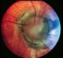 问题 男性,47岁,诉右眼眼胀痛,查见眼底表现酷似一朵盛开的牵牛花,视盘比正常的扩大35倍,视盘周围有色素环及萎缩区,视盘呈漏斗状,眼底检查如图,对该病描述正确的是 ( )