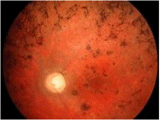 问题 以下哪些为视网膜色素变性(如图)的特征( )