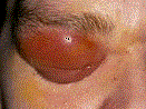 问题 患者,青年男性,左眼急性突出伴发热,眼部红肿有压痛。血液血白细胞分类检查提示中性粒细胞数增加。 最可能的诊断是(如图) ( )