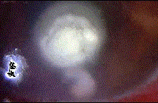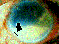 患者,男性农民,右眼被谷物弹伤,视物模糊1个月就诊。检查:右眼视力0.5,结膜充血,角膜有黄白色病灶,污秽,伴前房积脓。最可能的诊断是 (如图) ( ...