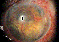 问题 患者,女性,70岁,高血压史5年,3个月前右眼突然视力下降,外院诊断为右眼缺血型视网膜中央静脉阻塞,予药物治疗。2天前,患者出现右眼胀痛。检查右眼视力数指,角膜上皮水肿,前房不浅,虹膜红变,晶状体尚透明,眼压40mmHg。 (如图)最可能的诊断是 ( )