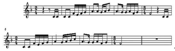 下面谱例所采取的歌曲创作手法为()。 A.模进 B.原样重复 C.变化重复 D.扩大