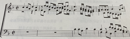 下面谱例共有几个声部? A.二声部 B.三声部 C.四声部 D.五声部