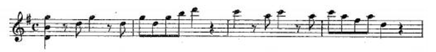 解析 谱例为莫扎特13首小夜曲中最为著名的《G大调弦乐小夜曲》。A项的J.C.巴赫是巴洛克时期的代表作曲家。B、C两项的贝多芬与格鲁克都是古典主义时期的作曲家,但是二人的作品中没有《小夜曲》。