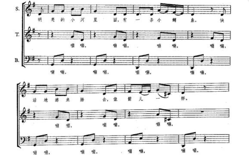 下面谱例中, 声部进入的先后次序是( ) A. 女高—男高—男低 B. 女高—女中—男低 C. 女高—男低—男高 D. 女高—女中—男高