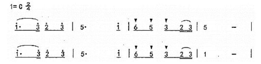 解析 同头换尾是指曲调前部分保持原状,后部分作变化重复。谱例中后四小节是对前四小节的变化重复,仅最后一小节不同,属于变化重复中同头换尾的形式。
