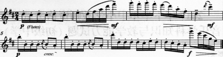 解析 《胡桃夹子》是柴科夫斯基编写的一部芭蕾舞剧,根据霍夫曼的一部叫作《胡桃夹子与老鼠王》的故事改编而成,整首作品共分三大段8曲。A选项《花之圆舞曲》是最后一段,也是《胡桃夹子》中著名的圆舞曲。节奏为三拍子的圆舞曲节奏,与图示谱例不符;B选项《俄罗斯特列帕克舞曲》选自舞剧第二幕中糖果仙子的盛大宴会中的音乐,是一首双拍子的俄罗斯舞曲,但旋律线与所示谱例不吻合;C选项《中国舞曲——茶》的节奏为四拍子,与所示谱例不吻合;D选项《芦笛舞曲》也是选自舞剧第二幕中糖果仙子的盛大宴会中的音乐,以长笛三重奏的形式展开主题,节奏轻快而带有诙谐的色彩,主题愉快活泼,宛若一首清新宜人的田园晨曲,这是一首著名的体现长笛特色的音乐.旋律与所示谱例吻合。