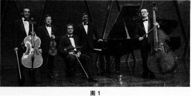 解析 钢琴五重奏的主要乐器是一架钢琴和四件其他乐器组成的室内乐重奏形式.这四种其他乐器通常为:第一、第二小提琴,中提琴、大提琴。图右侧为低音提琴.不符合钢琴五重奏的常规编制。