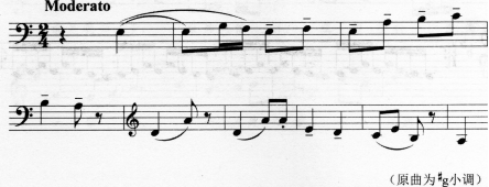 解析 该旋律片段选自俄国作曲家穆索尔斯基创作的钢琴组曲《图画展览会》中《古堡》的主题旋律片段。