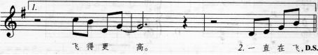 解析 D.S.记号是外语Da Segn0的缩写,意思是“从有记号处反复”。在乐谱中见到D.S.标记时就要从有“”记号处开始演奏,直到乐曲的结束。