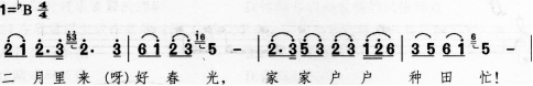 解析 该旋律片段选自冼星海的《生产大合唱》中的《二月里来》。该作品由“人民音乐家”冼星海在1939年3月作于延安,旋律柔婉流畅,情感细腻真挚,结构为典型的“起承转合”四句体乐段,具有恬静的江南风味和浓郁的民族风格。