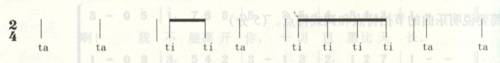 解析 节奏读谱:其中四分音符念作ta,八分音符念作ti。记谱时只留符干,不标注符头(二分音符、全音符除外)。这种记谱法是柯达伊教学法中重要的教学工具,来源于一种古老的英国记谱方式。
