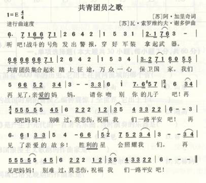 解析 《共青团员之歌》 一、教学目标 1.情感态度与价值观目标:通过学唱《共青团员之歌》,加深对祖国的热爱之情。 2.过程与方法目标:通过对《共青团员之歌》旋律的聆听和分析,把握前苏联音乐风格的特点,了解以进行曲风格为主并兼有抒情色彩的小调歌曲。 3.知识与技能目标:通过对歌曲中的附点节奏和切分节奏的练习,学生能够完整地、自信地、 有感情地演唱歌曲。 二、教学重点 1.学习歌曲。 2.掌握歌曲的情绪及演唱方法。 三、教学难点 1.对歌曲情绪的处理。 2.个别节奏的掌握及演唱。 四、教学过程 (一)导入新课 播放《共青团员之歌》,激起学生爱国之情。 (二)新课教学 1.咱们班有会唱这首歌曲的吗?(找几位同学分别演唱) 2.完整欣赏歌曲,找出几位同学演唱中存在的问题。 3.学习歌曲。 (1)师示范演唱歌曲。 (2)生跟琴视唱歌曲。 (3)完整演唱歌曲。 (4)及时纠正。 ①这首歌曲中带附点的节奏型,学生容易唱成不带附点的节奏型,这样对歌曲的艺术形象很有影响,因此,引导学生比较两种节奏型在这首歌曲中艺术表现力的优劣,指导学生将附点音符后面的十六分音符向下一拍靠拢是很有必要的。 ②歌曲中学生的节奏掌握如:“保卫国家,我们再见了亲爱的妈妈,请你吻别你的儿子吧,再见了亲爱的故乡。”都存在演唱第一个字时的八分音符加十六分音符,哪个字对准哪一个音符一定要看清、听清、唱清。 ③要正确掌握歌曲的速度。 复习演唱,并练习歌曲中容易出错的附点节奏和休止符节奏,为学习歌曲做铺垫。进入情境,这是一首大家都很熟悉的歌曲,但同学们根据自己原来的欣赏学习后避免不了存在很多问题,现在请同学们跟随老师认真学习,纠正和练习容易唱错的地方(附点节奏的掌握,休止符节奏的速度)。 (5)听音乐完整练习演唱歌曲。 (6)处理歌曲的感情:雄壮有力,而且平稳流畅。主题思想:热情奔放、乐观自豪。第二乐段:节奏舒展平稳,旋律优美流畅,因而形成一种浩浩荡荡、昂首挺胸、阔步前进的气势。 (三)巩固训练 分组比赛,看哪一组唱地既有感情又准确,看哪一组能较多地、正确地指出其他组的优缺点。 学生讨论歌曲,并结合到歌曲当中分析歌曲情绪的处理,演唱巩固练习。 (四)小结与作业 《共青团员之歌》把人们带入了艰苦卓绝的苏联卫国战争中,道出了苏联人民憎恨侵略战争、决不向敌人屈服,保卫家园、热爱和平的心卢。课下同学们找两首与《共青团员之歌》调式风格相似的前苏联音乐作品,并尝试用同样的学习方法来演唱它们。(如《喀秋莎》《三套车》等)