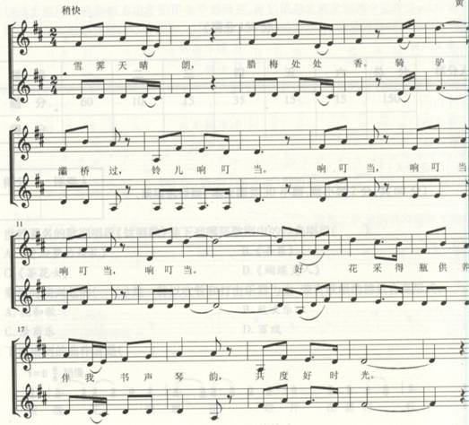 解析 首先,全曲为D大调,洋溢着快乐的气息。 其次,为带再现的两段体结构。 最后,全曲的旋律有以下特点: 第一段由两个各为4小节的乐句组成,旋律运用跳进与级进交替,显得活泼轻松,描绘了雪 后天晴,主人公悠闲自得地骑驴观景的画面。 第二段第一乐句以主三和弦分解进行的手法,加之顿音和休止符的运用,使旋律灵活跳跃,表现了铃儿清脆的响声,并与第一乐段形成对比。第二乐句则是第一乐段后句的扩充再现。 在歌曲短小的篇幅中,既有变化,又有统一,首尾呼应,简练而完整。二声部合唱中,低声部与旋律节奏同步,以主音为主,属啻为辅,穿插不多的几个经过音构成平稳的低声部旋律进行。
