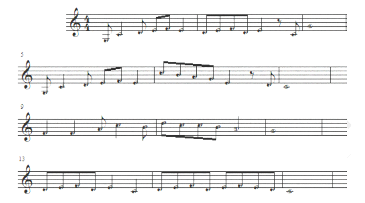 乐段写段。 要求: 1. 用下面谱例作为第一乐句,完成一个4乐句的乐段。 (5分) 2. 结构为“起承转合”。 (5分)
