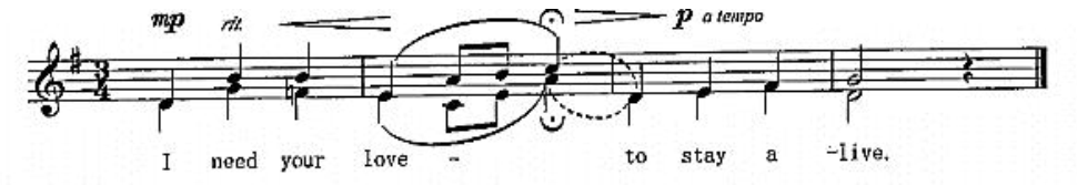 问题 下面谱例中第 2 至第 3 小节的虚线标记, 指挥应如何指示合唱队员演唱? ( )