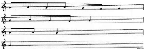 解析 该旋律运用了螺蛳结顶的旋律发展手法。螺蛳结顶是将原有的乐句逐步紧缩,直至最后形成简洁的顶端。谱例中的旋律发展符合这一特征,是减缩发展手法的运用。