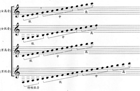 问题 参照下面人声音域表,判断合唱谱例中的声部Ⅲ是( )。 音域表