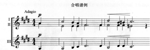 解析 合唱中不同的声部有相对应的人声音域,如图中音域表所示,女高音的音域是C1--c3,女低音的音域是e—f2,男高音的音域是C1--C3,男低音的音域是d-c3。谱例中声部Ⅲ的音集中在a—d2,属于低音。因此正确答案为C。