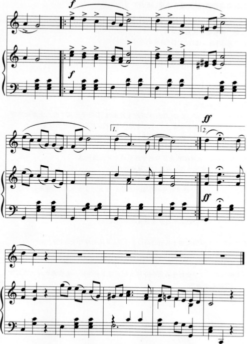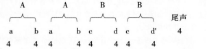 解析 (1)曲式结构图如下: (2)乐曲是由两个相同的A乐段与对比关系的B乐段构成,由于重复不占结构,因此该曲是一个不带再现的单二部曲式。 其中A乐段是对比关系的两个乐句构成,运用了节奏重复的写作手法。B乐段音区由中音区转为高音区,情绪更为欢快,由两个对比关系的乐句构成,由于B乐段对比性的两乐句较具动力性,因此在乐器最后加上了4小节的尾声,起到收束统一全曲的作用。 (3)该曲为C自然大调。 (4)主题句为A乐句,其中前两小节为主题句的主要动机为上行四度跳进与下行级进结合,前短后长的节奏特点使旋律更具有叙事性,后两小节是主题动机下二度的移位自由模进。 伴奏织体主要特征:半分解和弦和点状的柱式和弦。