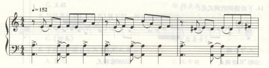 解析 谱例是阿根廷作曲家以及班多纽手风琴独奏家皮亚佐拉的作品《自由探戈》的音乐 片段。