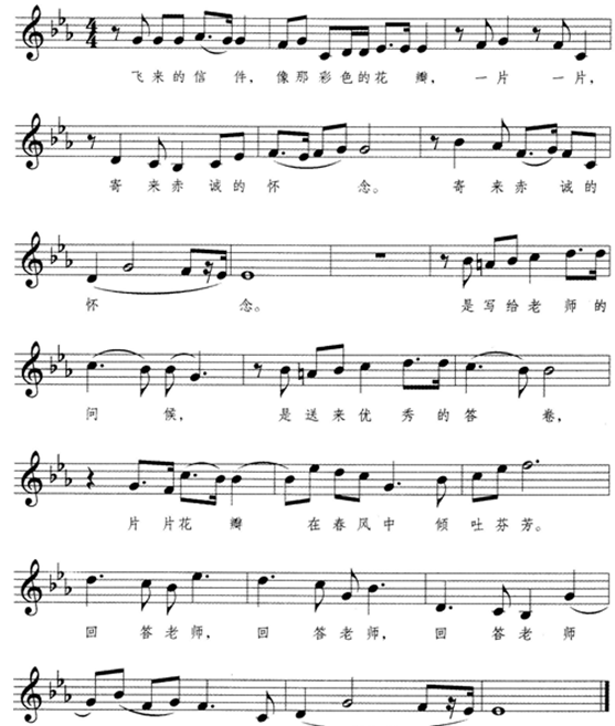 解析 (1)本曲为无再现的单二部曲式。结构图示为: (2)本曲为bE大调。 (3)A段为单声部,自然而近乎口语化的音乐主题于平易、亲切中饱含深情。弱起的节奏,朴实的音调及接下来的略为舒展的旋律,富于动感的音型伴奏下,恰似在“春风中”飘逸着的“片片花瓣”。B段与之对比,旋律提高了音区,但仍是以级进为主的平和的旋律进行,表达了对老师感怀的一种内心的激动。接下来为塑造“春风中”的意境,飘逸的旋律,至呼唤式的“回答老师”处达到了全曲的高潮。