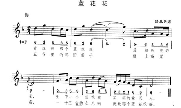 解析 (1)歌曲属于民歌小调中的信天游。 (2)歌曲为d羽五声调式。 (3)歌曲的旋律属于信天游的曲调,由上、下两句组成,曲调悠扬柔美,节奏舒缓自由,歌词口语化,很具地方特征。民歌以优美的旋律、叙事性的唱词,纯朴犀利的语言,歌颂了旧中国的农村姑娘蓝花花在封建礼教束缚下的叛逆者形象。 (4)歌曲主要流行于陕西和青海、甘肃、山西部分地区。