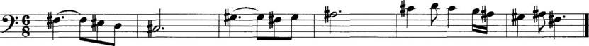 解析 旋律中出现了#F、#E、#C、#G、#A,最后音落在#F上,若为#F大调的话,调号应为六个升号(#F、#C、#G、#D、#A、#E),但是D音没有升高,相当于降低,符合#F和声大调降低第四级音的条件,所以为#F和声大调。