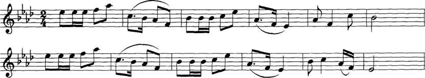解析 此旋律属于重复中的变化重复技术,只重复旋律的一部分,而将另一部分(句首、句腹、句尾)进行变化,此旋律片段属于变化句尾。