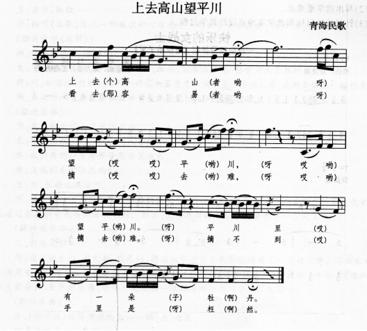 解析 (1)《上去高山望平川》为F,4/4拍的歌曲。 (2)《上去高山望平川》的曲调是“河州令”。“河州令”是花儿中流行广、影响大、最有代表性的曲调之一。歌词寓意深刻、富于想象,旋律高亢开阔、自由舒缓,富有西北地方特色。曲中仅用了四个音:d0、re、sol、la,d0是经过音.起调和色彩的作用,re—sol和re—la-sol作为乐句落音的处理,加上节奏的张弛和腔化的演唱,使音乐显得宽广、悠远。 (4)乐句间主要结构特点:乐段由上下两个乐句构成,乐句悠扬宽广,起伏度大,深刻地抒发了在旧社会中. 青年男女纯真的爱情由于封建礼教的束缚和封建势力的阻挠而不能实现,只能望花兴叹的感慨心情.
