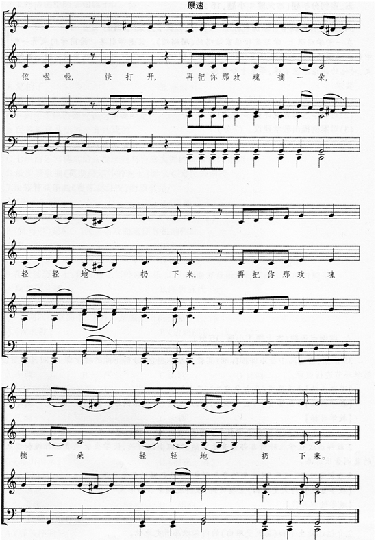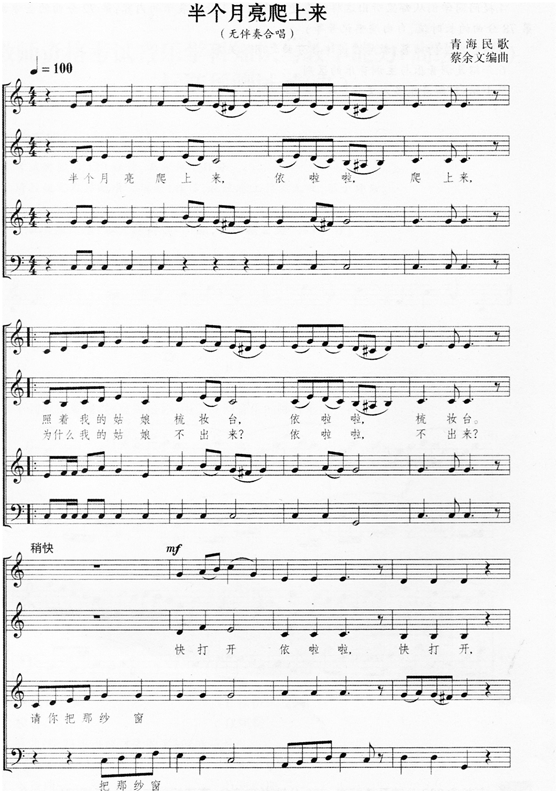 相关内容:依据,普通高中音乐课程标准(实验),理念,设计,高中,音乐,合唱,教学,目标,环节,对象,中学生,教学内容,半个月亮爬上来,要求