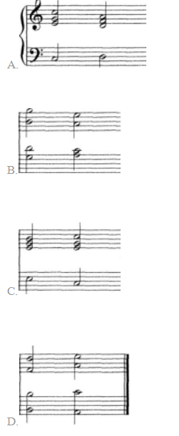 解析 两个和弦连接时,将和弦中的共同音保持在相同的声部内,叫作和声连接法。没有共同音保持或者两个和弦连接时虽有共同音但不保持在同一声部,称为旋律连接法。C选项中E、G保持在相同声部属于和声连接法,A、B、D选项都属于旋律连接法。