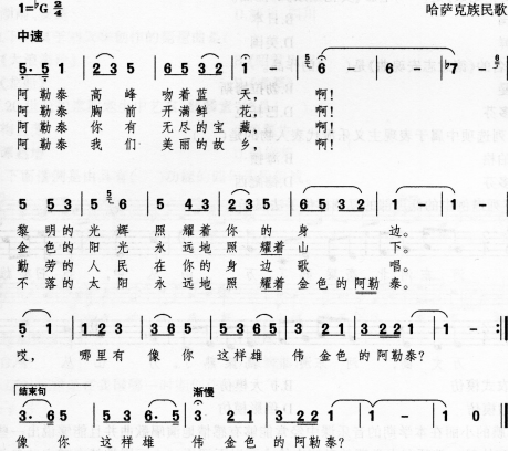 解析 (1) (2)这首歌歌颂了阿勒泰的群山及群山下的草原牧场,歌颂了阿勒泰的自然风光.也表现了哈萨克人民热爱家乡的纯朴感情。 (3)歌曲为三乐旬结构,歌曲中的一个乐句跨两个词句非常有代表性。歌曲中的“7”具有非常鲜明的民族色彩和地方特色,凸显哈萨克民歌在曲式结构上的民族特征。