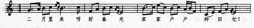 解析 上谱例是冼星海《二月里来》的旋律片段。上谱例中四个乐句在主题材料上既没有明显的对比.也没有单纯的重复.而是按照“展衍”的原则逐渐加进新的因素.阂而四个乐句构成一气呵成的一个段落.而不是两个段落.四个乐句的调式和凋性也是统一的,由此可以分析出该段旋律是由具有起承转合功能的四句乐段组成,考生需要注意的是“转”的功能并不体现在调式、调性的不稳定,而是表现在第三乐句结束在调式内部的不稳定音上。 名师如何巧解题?查看视频解析>>