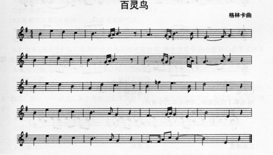 解析 (1)e自然小调转G自然大调转e自然小调(2)曲式结构图为: (3)特点:从整体的曲式结构上来看此乐段为五乐句乐段,前四小节为a部分是第一乐句.其中第二乐句(5-8小节)和第四乐句(13—16小节)是对第一乐句进行了扩充从而形成。b部分(5~8小节)作为新材料出现在乐曲的中间部分,也是此乐段的高潮部分,充分体现了a+a1+b+a2+a3,对称五乐句乐段的结构特点。 (4)特点:①歌曲旋律整体以4/4拍为节奏,以四分音符、四分附点音符以及八分音符为主要构成织体。②音乐旋律简洁明快、音乐线条流畅优美,恰似一只百灵鸟在飞翔中引吭高歌的场面。③第2小节出现了此乐段采用最多的音乐织体构成形式:四分附点音符紧接两个十六分音符的音乐织体。这种特殊的构成形式在此乐段中共出现了六次之多,这一节奏型表现出了百灵鸟展翅高飞时啼鸣的韵律。④在此乐段的第11小节中出现了临时变化音还原f2,这个乐句也是此乐段的主题高潮呈现部分,此处还原f2的出现改变,在作曲技巧上改变了主音阶的走向,修饰了单一调式的反复化和枯燥化.突出增强了旋律的美感。
