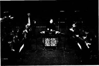 解析 图中是丝竹乐乐队的基本编制,包括二胡、中胡、琵琶、三弦、扬琴、笛、笙、一件打击乐器(鼓、碰铃、板)。