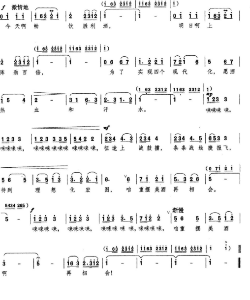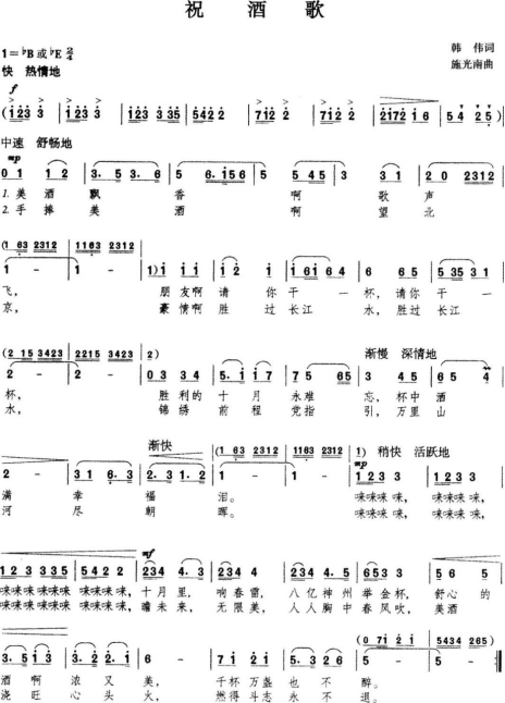 解析 (1)教学目标 【情感·态度·价值观】体会粉碎“四人帮”、亿万人民欢庆十月胜利激动、喜悦的情绪,认识到音乐思维的解禁对繁荣发展中国音乐文化的重要意义,珍惜今天的美好生活。 【过程与方法】在聆听、感受、体验歌曲的活动中,提高音乐感知能力、音乐审美、鉴赏能力,以及音乐的想象力和创造力。 【知识与技能】了解民族音乐元素在歌曲中的运用,掌握歌曲的情绪和风格特征。分析歌曲的调式调性、曲式结构,掌握复二部曲式。 (2)教学过程 (一)新课导入 教师弹唱歌曲《祝酒歌》,提问:歌曲中讲到了什么 多媒体展示课题:歌曲《祝酒歌》。 (二)新课教学 1.简介作曲家 师:大家在课下已经搜集了施光南的相关资料,谁能和大家分享一下学生举手回答。 教师总结:施光南是新中国成立后培养的新一代作曲家,被称为 “时代歌手”,是“人民音乐家”。代表作有《最美的赞歌献给党》《打起手鼓唱起歌》《吐鲁番的葡萄熟了》《在希望的田野上》《祝酒歌》《周总理,您在哪里》《月光下的凤尾竹》《假如你要认识我》、声乐套曲《革命烈士诗抄》、小提琴协奏曲《瑞丽江边》、舞蹈音乐《鸿雁高飞》、歌剧《伤逝》《屈原》、芭蕾舞音乐《白蛇传》等。 2.整体欣赏歌曲 (1)初次欣赏乐曲,感受乐曲情绪 师:歌曲表现了什么样的音乐情绪(歌曲表现了举国上下亿万群众欢庆十月胜利,沉浸在喜悦之中的情景。) (2)再次欣赏乐曲,给乐曲划分段落 3.分段欣赏歌曲 (1)欣赏第一乐段 ①欣赏引子 大家对这个节奏熟悉吗(这种节奏是我国北方民间吹打乐中常用的锣鼓点节奏型.主要用于前奏、尾声等,锣鼓点节奏欢快而跳跃,表现鞭炮齐鸣、锣鼓喧天、举国欢腾的场面。) 个别学生敲击锣鼓点节奏型(教师引导学生做渐强处理)。 ②欣赏第一乐句 借鉴中国戏曲音乐的甩腔。 教师引导学生唱一唱第一句中 “啊”的旋律.提问:旋律中采用了什么音乐元素表达了什么样的情感(音 乐开始的“啊”字的轻微感叹,借鉴了戏曲音乐的甩腔,不仅美化了旋律线条,而且表达十年“文革”磨难,人们内心难以言表的辛酸) 教师出示新疆典型的打击乐器手鼓,示范新疆典型的节奏型: (用于音乐A段及由之变化的C段,这是一种舞曲的节奏,表现人们载歌载舞欢庆胜利的喜悦心情。) (用于歌曲的过门,做长音的节奏填充,增加旋律的活力。) 个别学生敲击新疆典型的节奏型。 ③欣赏第二乐句,感受江南民歌韵昧 教师讲解: “洒”字的装饰音深情演唱以及“幸福泪”处的几个附点音符的跌宕,更是深入地表现了人们的真情实感。其中也蕴含着江南民歌亲切、委婉的音调。这是从那场大灾难中走过来的人们的共同呼声。 (2)欣赏第二乐段 师:相比之前的音乐这段的音乐情绪有哪些变化 学生回答(之前的音乐情绪,比较优美、舒展,这段的音乐情绪变得欢快活泼。) 学生视唱歌词,体会欢快活泼的情绪。 (3)欣赏第三乐段 师:这一段旋律有哪一句的影子情绪有什么变化(这一曲凋是从第一乐段的第二乐句演变而来,经过作曲家将它们有机地融合在一起,充分抒发了各族人民喜庆胜利的欢乐情绪。) ②衬词 师:这两个乐句采用了什么写作手法(提高八度再现了衬腔的旋律,接着又用扩展的手法将节奏拉宽,以 级进上行的旋律,推出全曲的高潮,歌曲在热烈欢腾的气氛中结束) (三)巩同提高 1.了解复二部曲式 教师展示歌曲的曲式结构: 复二部分曲式 师:复二部曲式是相对于单二部曲式更加复杂的一种曲式,它是建立在单二部曲式的基础上,由两个二部曲式构成的乐曲称“复二部曲式”。 2.完整地欣赏李光曦演唱的歌曲.体会歌曲的风格。 (四)课堂小结 学生谈欣赏感悟,对学生进行爱国主义教育。