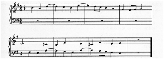 解析 从谱例中可以发现被模仿的起旬为第一行中高音谱表上的旋律,模仿的应句为第二行低音谱表中的旋律,应句与起句的节奏完全一样,且从旋律走向来看,起句相邻音间的距离与应句相邻音之间的距离相同,但起句旋律音高整体比应句旋律高四度。其中,A选项中音程模仿是将起句移高或降低一定音程度数进行模仿,符合题意。