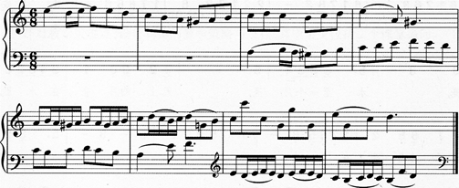 解析 A选项,扩大模仿是指将起句的每个音的时值按一倍或两倍的比例加以伸长,形成旋律句法长度上的变化;B选项,紧缩模仿是指将起句的节奏按比例加以缩短,形成旋律句法长度上的变化;C选项,倒影模仿是指将起句首尾倒置,形成旋律方向上的变化。而谱例中的节奏与旋律方向并未发生变化;D选项,逆行模仿是指当应句声部模仿起句时,以起句的逆行形式写作.即应句模仿起句时或乐节加以首尾倒置,形成旋律方向上的变化,只有C选项符合题意。