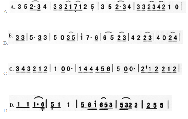 解析 B选项为德国勃拉姆斯的著名代表作品之一《摇篮曲》。该曲曲调优美抒情,语气安详平缓,情绪亲切、温柔、恬静,细腻地勾画出一幅母亲对孩子亲切祝福的动人画面。A选项为舒伯特的《摇篮曲》,是其根据诗人克劳谛乌斯的同名诗歌创作的一首艺术歌曲。C选项是莫扎特的《摇篮曲》。D选项为我国东北地区的《摇篮曲》。