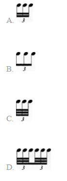 解析 将基本音符分成均等的三部分,用来代替基本划分的两部分,叫“三连音”。B选项相当于两个八分音符,与四分音符等同,因此正确答案为B。