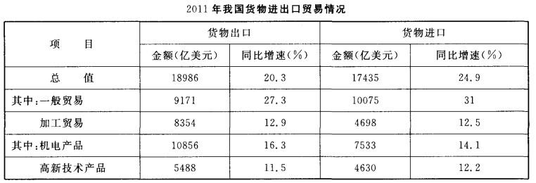 2011年,我国货物进出口总额36421亿美元,同比增长22.5%。2011年,我国国有企业货物出口 2672亿美元,同比增长14. 1%;外商投资企...