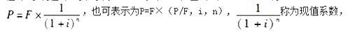 解析 现值是指按规定的贴现率,同某一时间的资金额等值的任何较早时间的资金额。已知终值F,求现值P,可表示为:(P/F,i,n),由公式F=P(1+i)n得:,用PW表示。