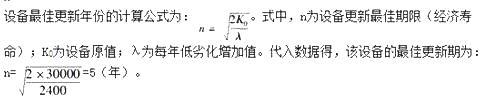 问题 某饭店购进一台设备,该设备原值K0=30000元,每年低劣化增加值为λ=2400元,则该设备的最佳更新期为()年。