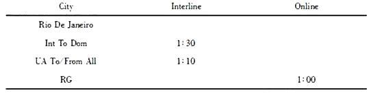 解析 需要考虑在巴西里约热内卢的机场美国联合航空公司(UA)航班与巴西航空公司(RG)国内航班能否衔接。由题中里约热内卢机场MCT可以看出:国际转国内(Int To Dom)的情况中,美国联合航空公司(UA)航班转其他国内航线(UA To/From All)需要花费的最短衔接时间是1小时10分钟。而该旅客在里约热内卢停留时间只有1小时5分钟,因此不能够完成转机。