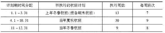 解析 为了适应航空运输市场需求的变化,我国航空公司目前每年编制两期航班计划。一是夏秋航班计划,自3月下旬至10月下旬执行;二是冬春航班计划,自10月底至来年3月下旬执行。飞行班次是指飞机自起点站到终点站的飞行次数,按单程计算;公式①:飞行班次=2∑(每周班次*执行周数);公式②:飞行班次=2(年初每周班次*全年周数+计划期每周增加班次*自增加日至年末周数-计划期每周减少班次*自减少日至年末周数)。 在计划工作中,全年按52周算,每季按13周算,2个月按9周算,1个月按4周算。计划时间与周数分配如表所示。 飞行班次=2*(7*13+9*30+8*9)=866(班); 或:年飞行班次=2*(7*52+2*39-1*9)=866(班)。