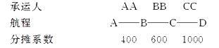 解析 分摊商数=实际被分摊额参与分摊航段分摊系数之和;某航段的分摊结果=承运航段分摊系数*分摊商数。本题的分摊商数=1000/(400+600+1000)=0.5,AA的分摊结果=400*0.5= USD 200.00,BB的分摊结果=600*0.5= USD 300.00,CC的分摊结果=1000*0.5= USD 500.00。