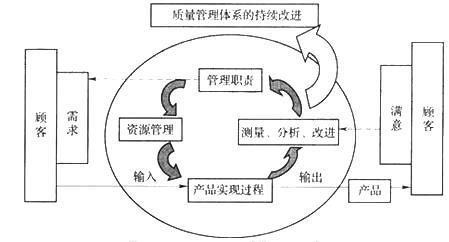解析 ISO9000质量管理体系标准鼓励组织采用过程方法开展质量管理活动。图所反映的以过程为基础的质量管理体系模式展示了质量管理各部分内容(管理职责、资源管理、产品实现过程、测量分析和改进)的过程联系,并构成一个持续改进的循环。该过程模式的输入端是顾客的需求,输出端是顾客的满意。 图 以过程为基础的质量管理体系模式
