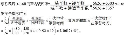 设某铁路局2010年日均装车5626车,日均卸车6300车,日均接运重车7357车,年货物周转量86972百万吨公里,货车全周转距离480公里,中转距离1...