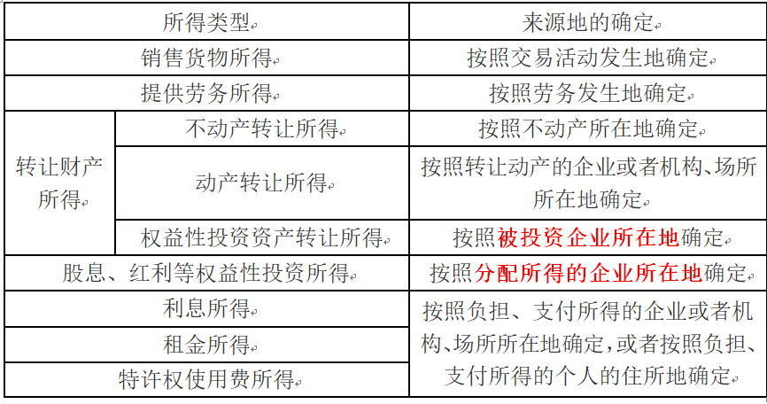 选项 A.权益性投资资产转让所得,按照投资企业所在地确定 B.利息所得,按照负担、支付所得的企业或者机构、场所所在地确定 C.转让动产所得,按照所转让动产的所在地确定 D.股息、红利等权益性投资所得,按照取得所得的企业所在地确定 E.转让不动产所得,按照转让不动产的企业或者机构、场所所在地确定 F.销售货物所得,按照交易活动发生地确定 G.租金所得,按照负担、支付所得的企业或机构、场所所在地确定 H.特许权使用费所得,按照负担、支付所得的企业或机构、场所所在地确定 I.提供劳务所得,按照劳务发生地确定